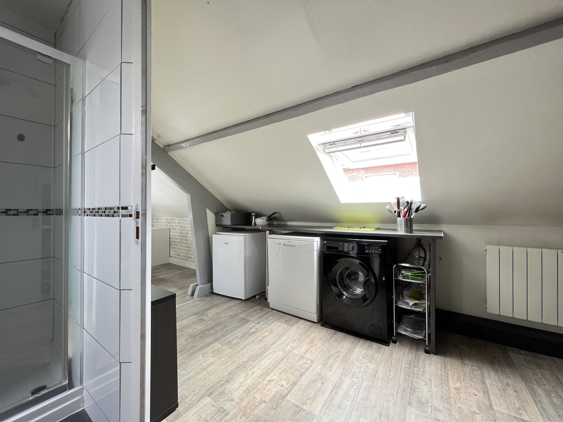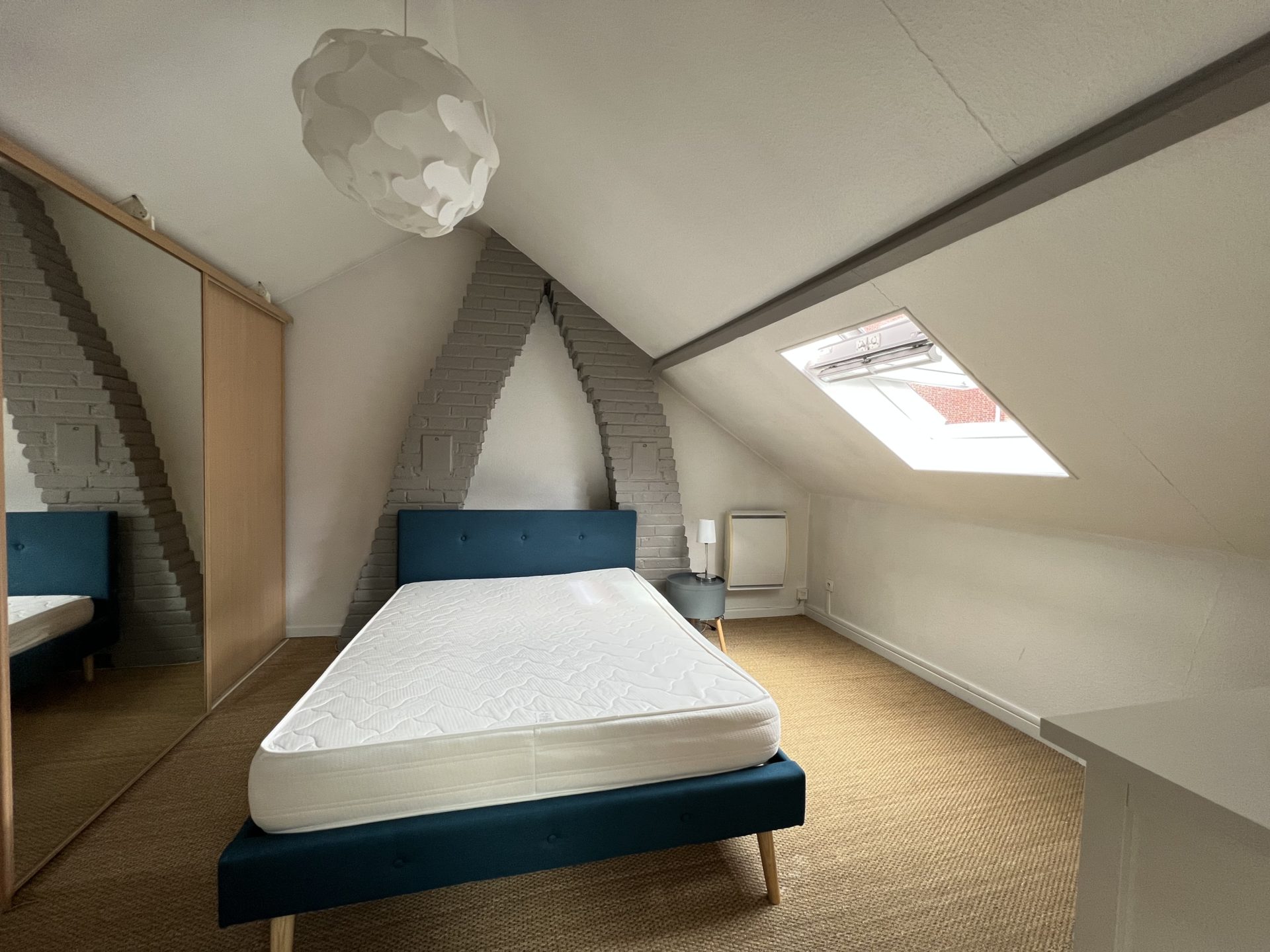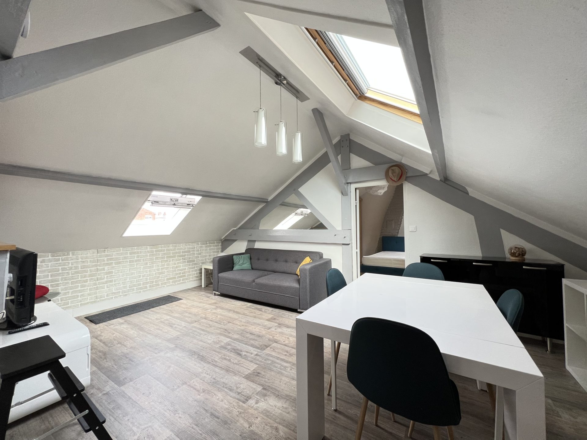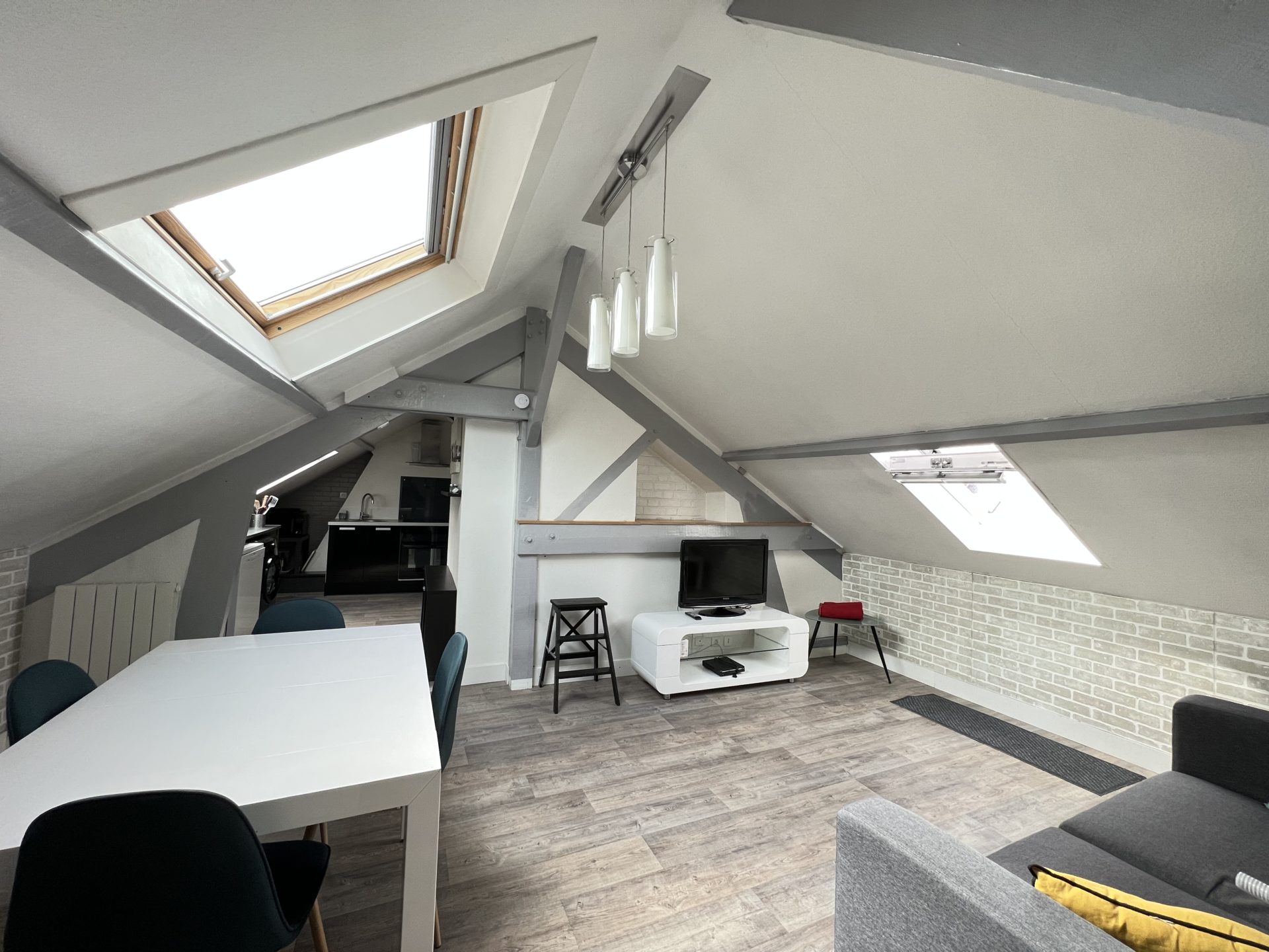 Rue Florimond Leroux, au 2ème étage d’un immeuble calme sans ascenseur, bel appartement meublé sous combles de 47 m² au sol (29,9 m2 Loi Boutin) parfaitement équipé comprenant :