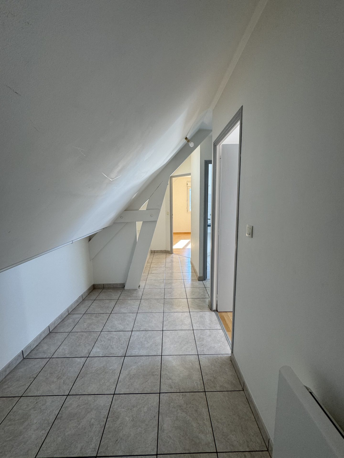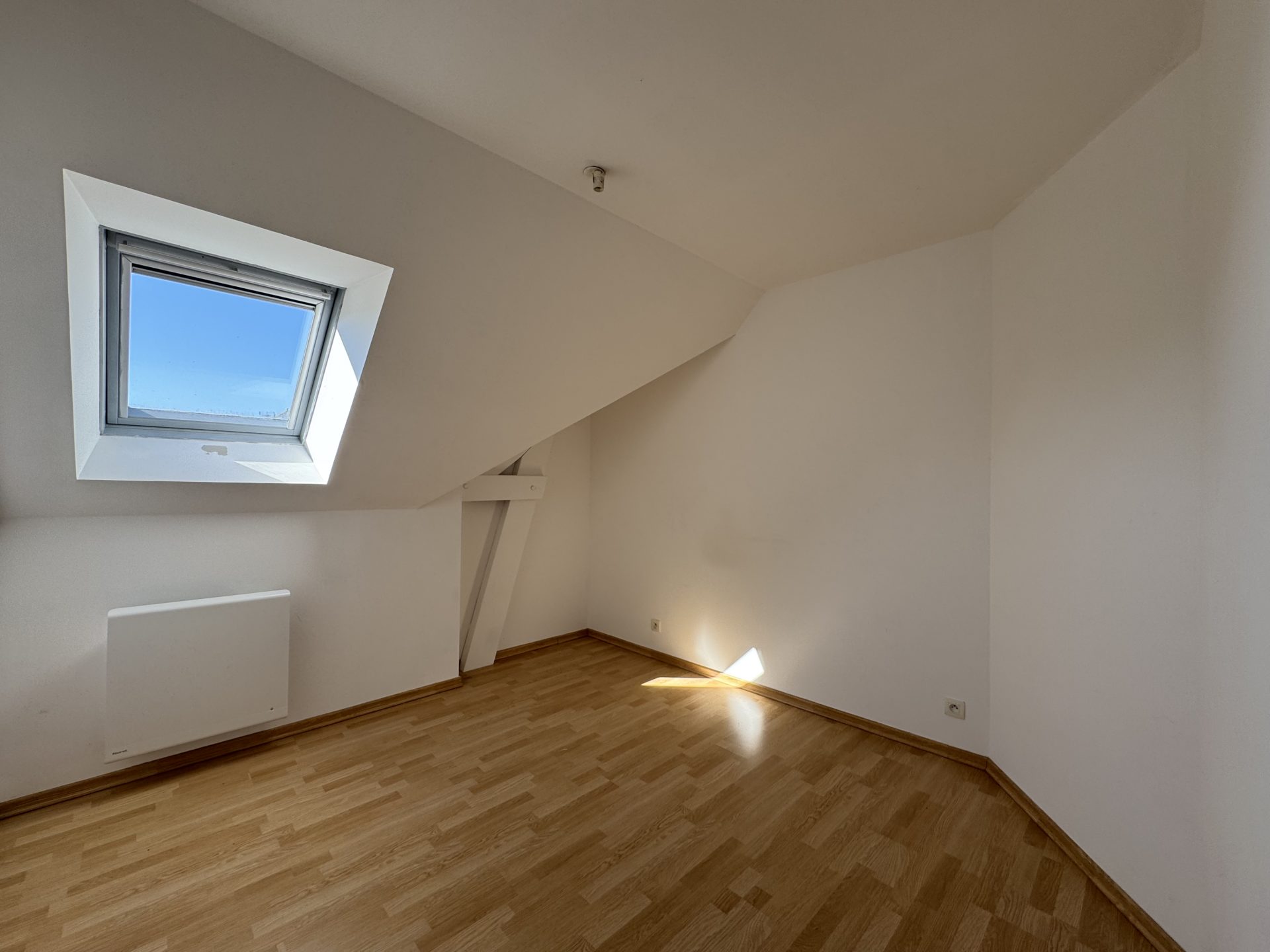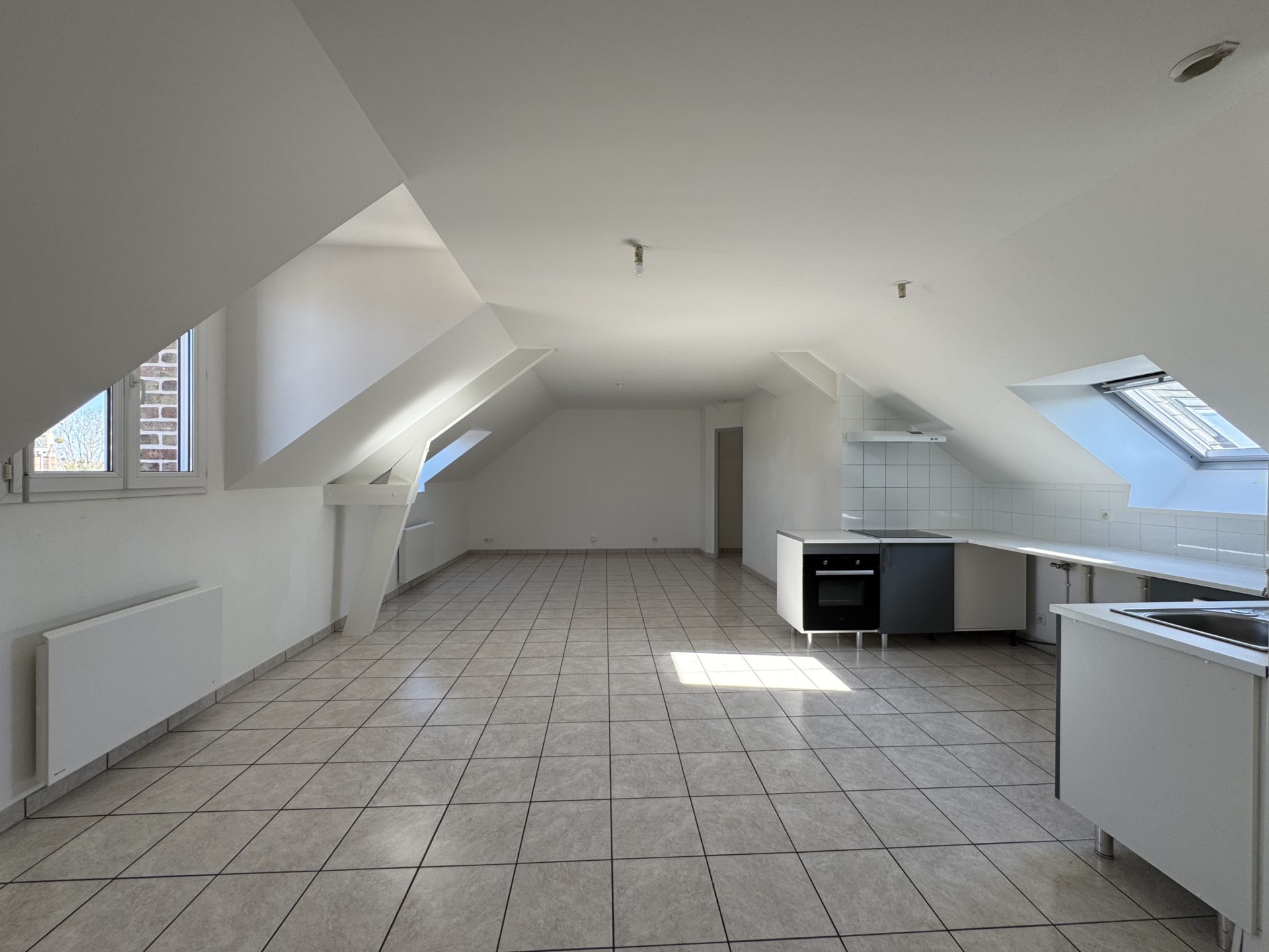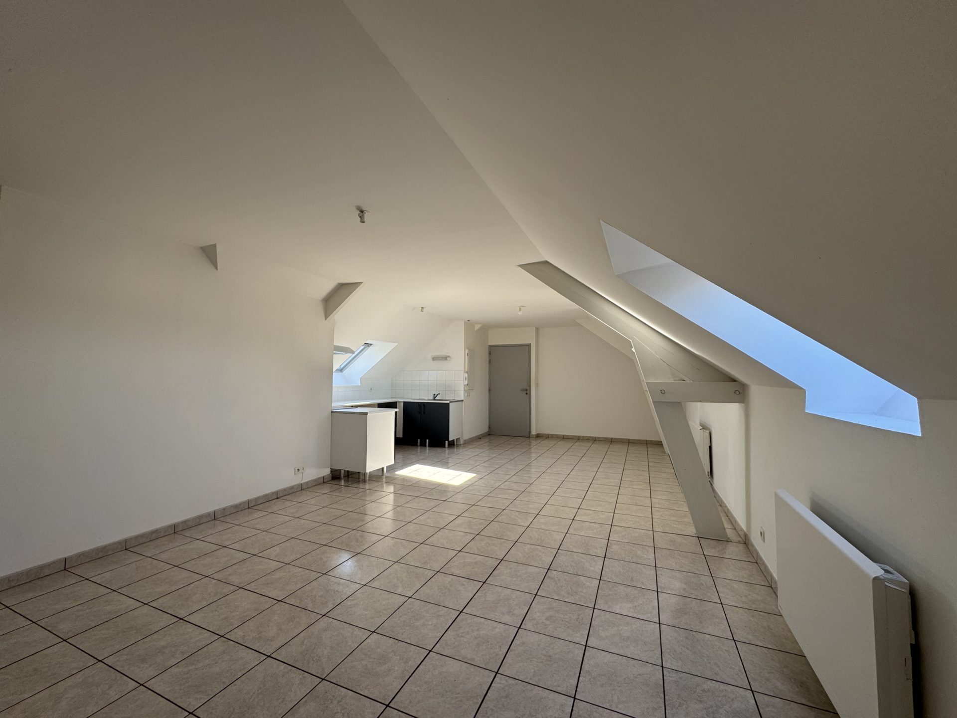 Grande pièce de vie de 34 m² avec cuisine ouverte aménagée, 2 chambres, salle de bains, wc. Chauffage électrique.