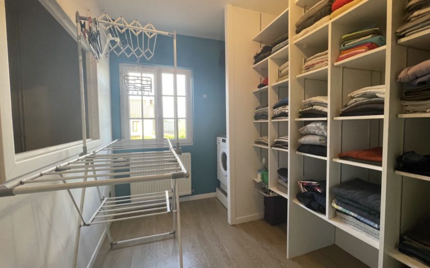 Étage 1 : Un couloir desservant deux grandes chambres avec placards, un dressing lumineux avec coin laverie, une salle de bains avec baignoire, douche à l’Italienne, meuble double vasques WC, et chaufferie.